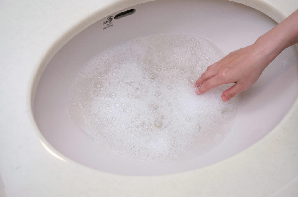 2. 次に、洗面器やシャンプーボールに人肌程度の温度のぬるま湯を貼って、シャンプー剤を1回分溶かします。そこにウィッグを静かに入れます。手櫛でいいですので、軽くかつらの髪をお湯の中で梳かします。