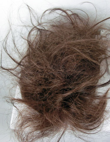 あまりにシャンプーをせずに放置していくと、髪の毛の中に汚れがたまって、いざ、シャンプーしようと水の中にかつらをつけた瞬間に汚れが水分を大量に含んでしまい、髪の毛が瞬間で石綿のように固まってしまいます。すごい毛がらみを起こします。(下写真)ひどい場合は、ほどくことができず、修理も不可能になった事例もありました。たとえば、中高生で部活で毎日すごく汗をかく運動をしている人などは要注意です。それから、何度もヘアワックスで固めたウィッグも要注意です。今までに何度も石綿のように毛がらみ事故を起こしています。